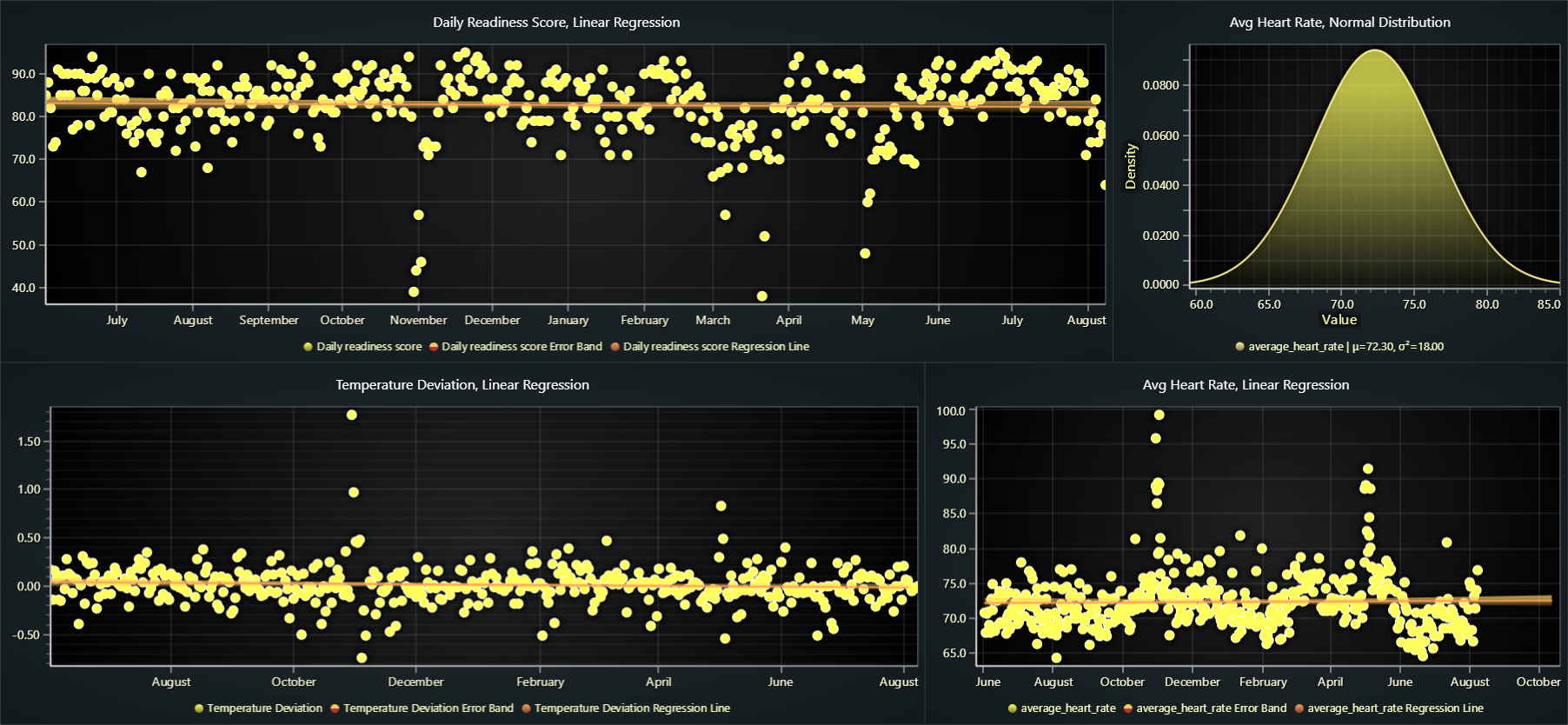 It shows the daily readiness score, temperature deviation and average heart rate during the same timeframe, a bit over a year.