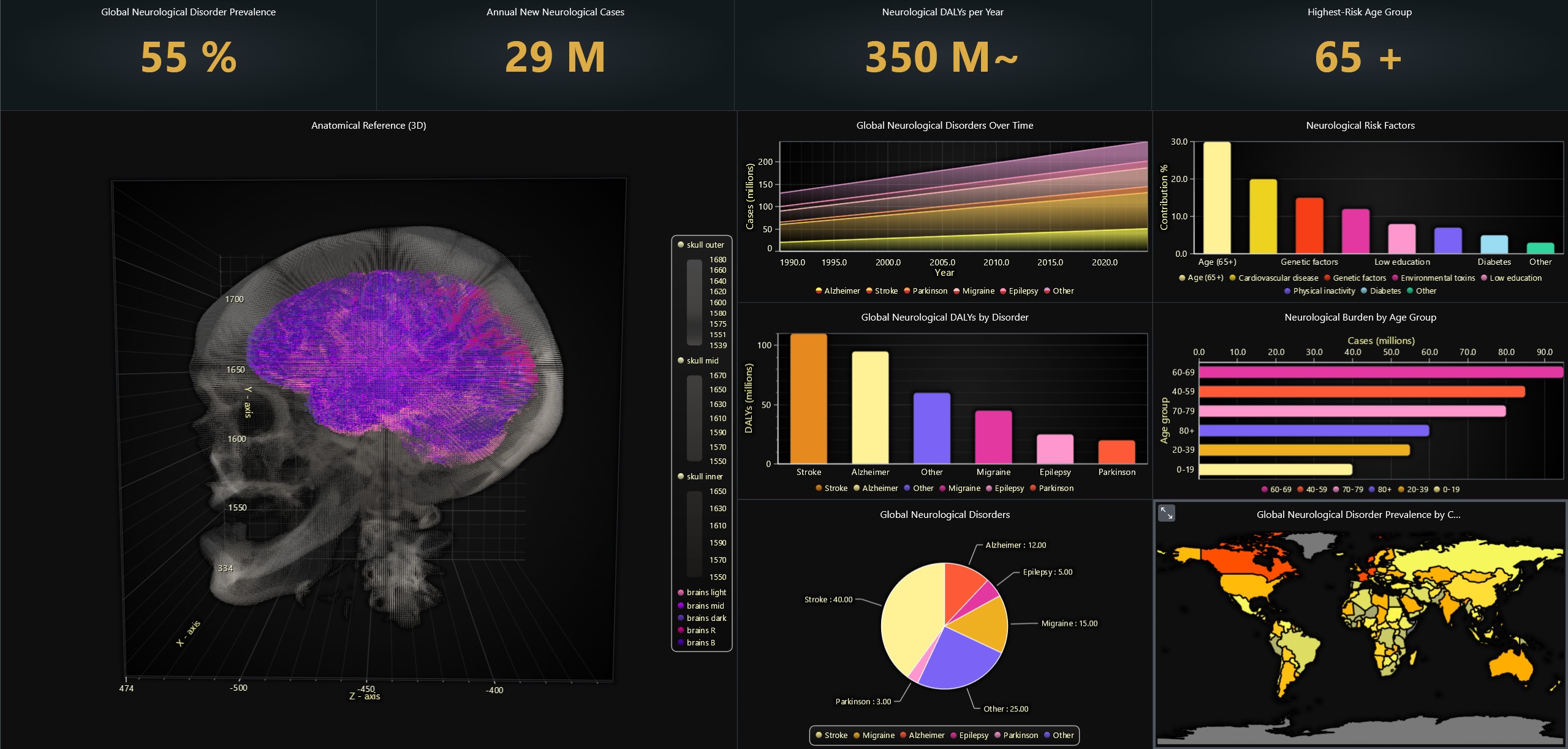 I’ve just wrapped up a multi-page Dashtera dashboard focused on neurological disorders, built to explore both population-level trends and anatomical context.